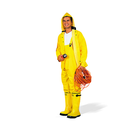 35 mm 3 piece 2 PLY P.V.C. heavy duty rainsuit with super strong polyester lining. Features electronically welded seams, take up snaps on sleeves and ankles, and a soft lining for extra comfort. It also has a detachable roomy drawstrings hood and a ventilated cape back for extra comfort, two flapped pockets. It is soft and pliable even in low temperature, has a high visibility color and is 100% waterproof.