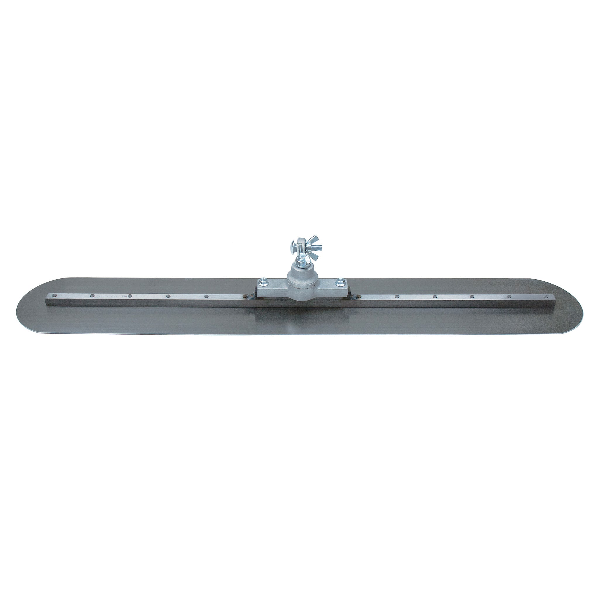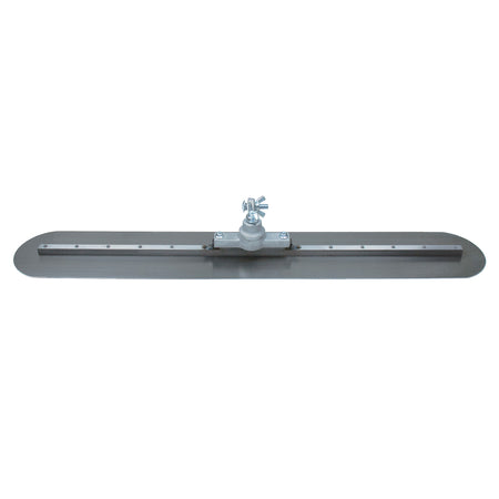 This 3' fresno trowel is made with high quality, tempered steel for a perfect finish. Use this quality fresno to finish concrete to a smooth, hard surface. Round ends on the 5" blade eliminate gouging of concrete for a smooth finish. A 33" long 1/2" square steel mounting is centered on the 36" blade to help keep the trowel flat. A strong cast aluminum bracket is attached to the fresno. The unique all-angle bracket rotates 360 degrees around its center to work from any angle for even coverage. The bracket is designed with teeth to keep handle at set angle without slippage. The bracket fits clevis handles or use an adapter to accept button or threaded bull float handles. Attach one or more groover bits (sold separately) to turn this tool into a groover for more versatility. Proudly made in the USA.