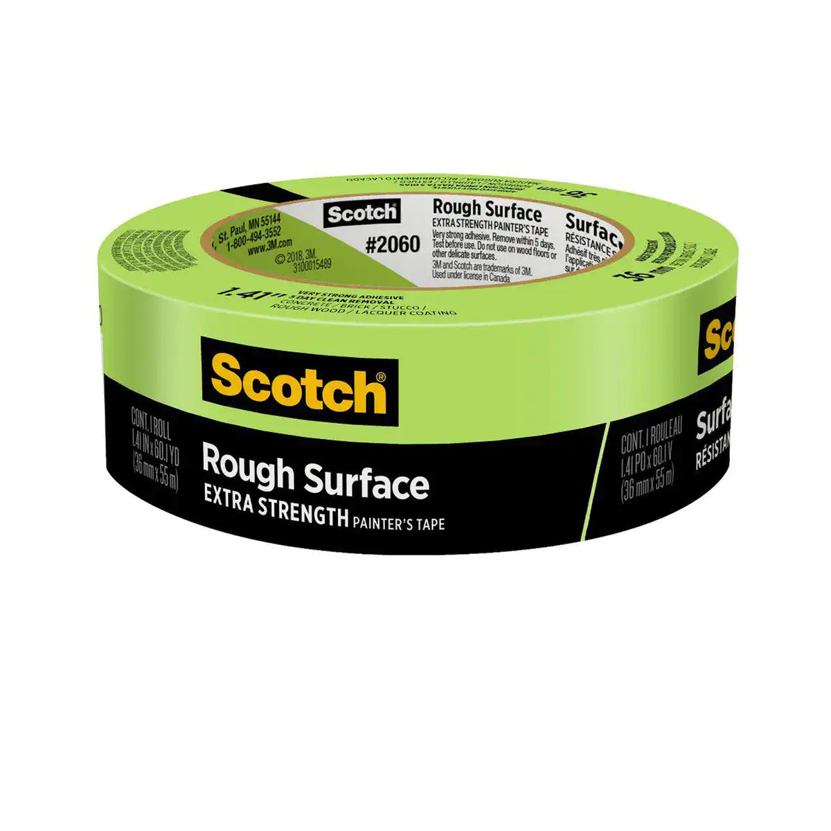Scotch Rough Surface Extra Strength Painter's Tape features a very strong adhesive designed for performance on rough, non-damageable surfaces for the protection you need to get the job done. This paint tape bonds aggressively to brick, concrete, stucco or rough wood, and it's recommended for use with or on lacquer coatings. Scotch Rough Surface Painters Tape holds strong to interior surfaces for 5 days and exterior surfaces for 3 days while removing easily without leaving any sticky residue behind. Resistant to UV rays, sunlight and moisture, Scotch Painter's Tape is an ideal indoor and outdoor tape, letting you conquer wow-worthy painting projects on multiple surfaces. Made from 50 percent renewable resources with a core made from 70 percent post-consumer waste, this solvent-free painter tape is made in a zero-landfill site certified for energy management to provide you with a sustainable painting product. To use, apply the painting tape firmly onto a clean, dry and dust-free surface and let sit for 30 to 60 minutes before painting. Wait until the paint is dry before removal. The best paint jobs start with Scotch Painter's Tape. With a full range of adhesive solutions, Scotch Brand delivers confidence in superior results to get the job done right and effectively the first time. Scotch Brand offers a full line of tapes specifically designed for the various demands of the project/job.