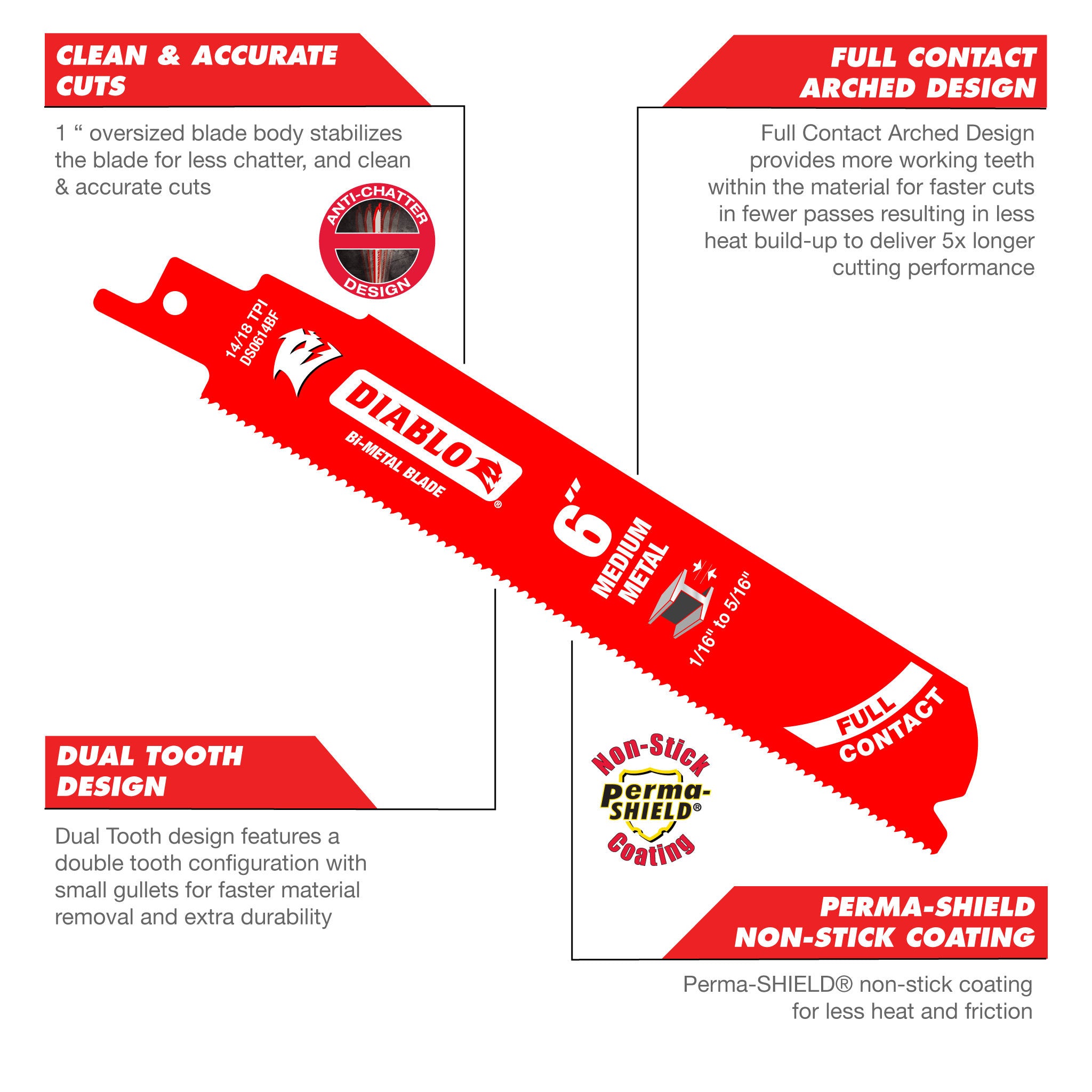 Diablo's next generation reciprocating saw blades with Full Contact Arched Design are specifically designed for maximum performance in metal cutting applications. The blade’s Full Contact Arched Design with ultra hardened cutting edge provides faster cuts in fewer passes resulting in less heat build-up to deliver 5x longer cutting performance than those of standard blades.