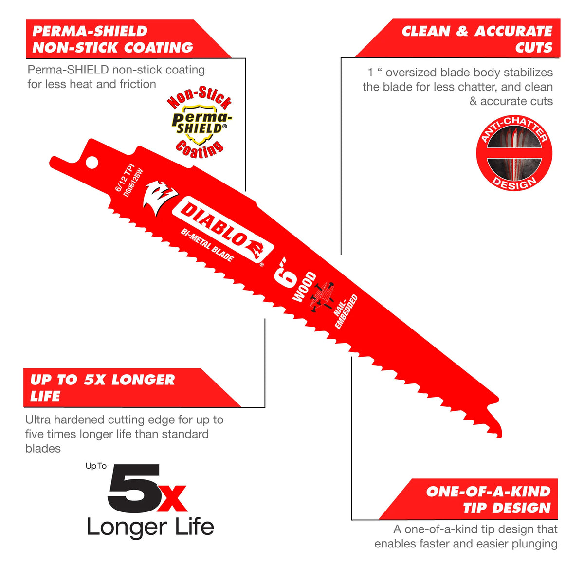 Diablo's reciprocating saw blades are specifically designed for maximum performance in nail-embedded wood applications. These high performance blades feature bi-metal technology that delivers up to five times longer life of standard blades on the market. Diablo's patented variable tooth technology provides faster cuts with less vibration.