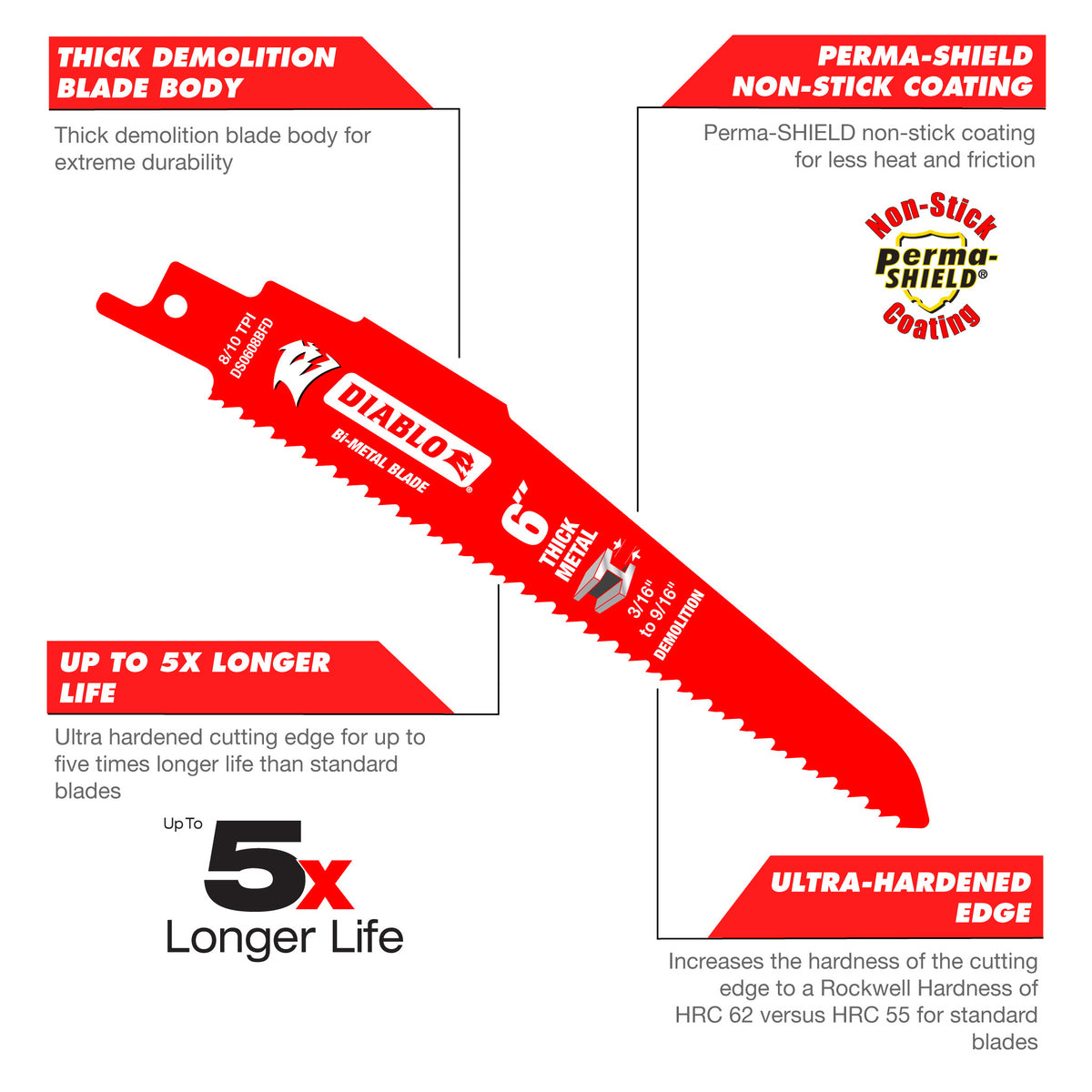 Diablo's reciprocating saw blades are specifically designed for maximum performance in metal demolition applications. The blade’s ultra hardened cutting edge delivers up to five times longer life than those of standard blades. Dual Tooth design features a double tooth configuration with small gullets for faster material removal and extra durability.