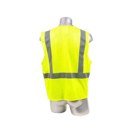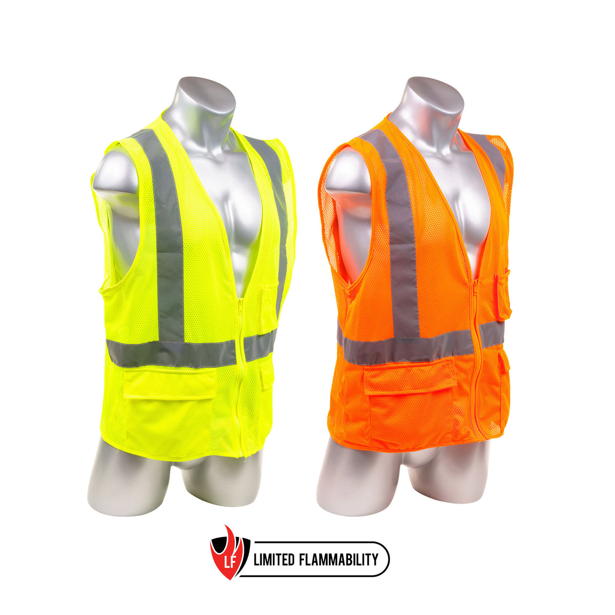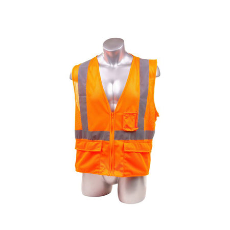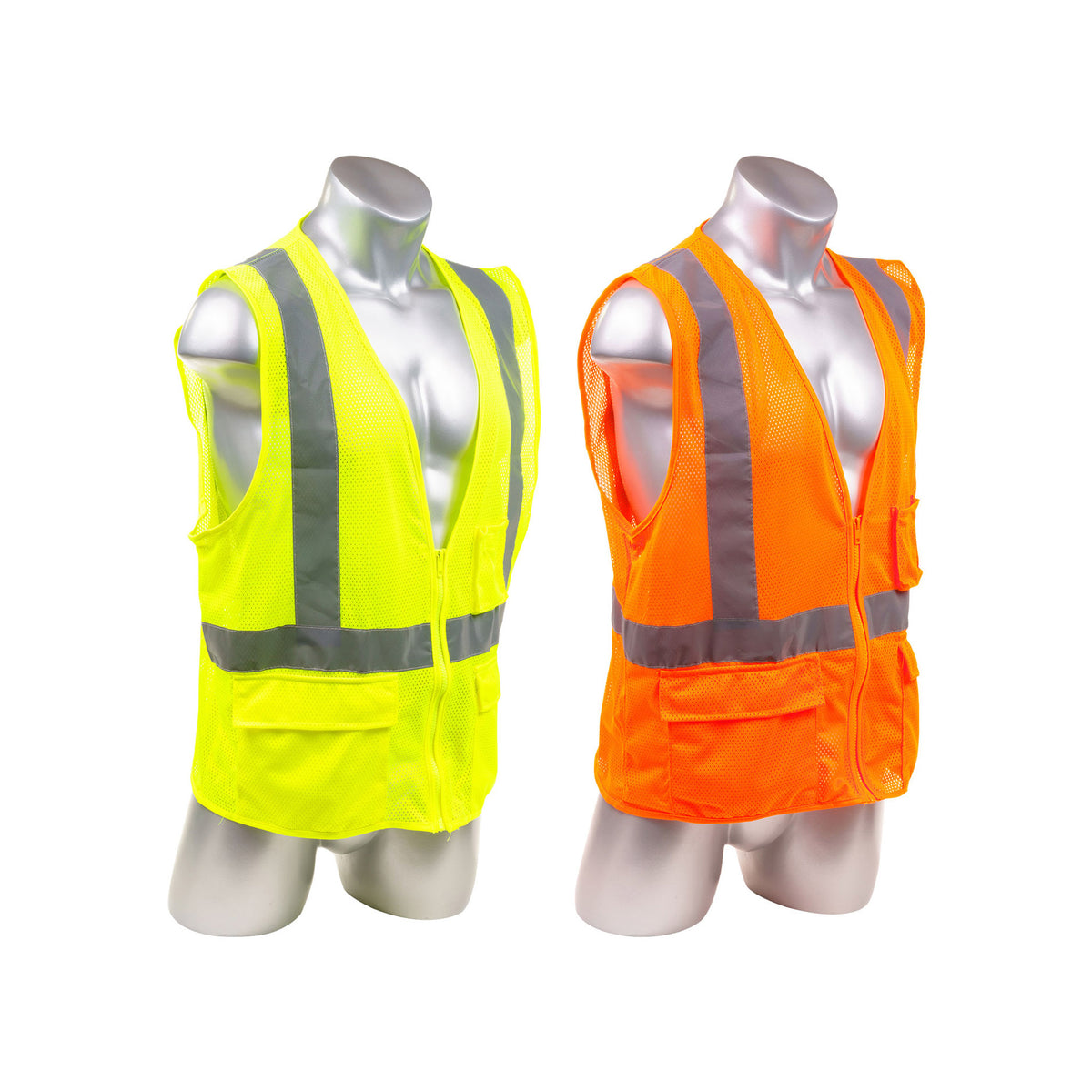 A hi-viz safety vest that comes in bright fluorescent colors with a reflective silver tape to ensure proper visibility. Perfect choice for crossing guards, utility, emergency work, airport luggage handlers, highways, and surveyors. Detailing include zipper front closure, silver reflective tape in suspender pattern over top of shoulders and a 360-degree reflective band encircling torso.