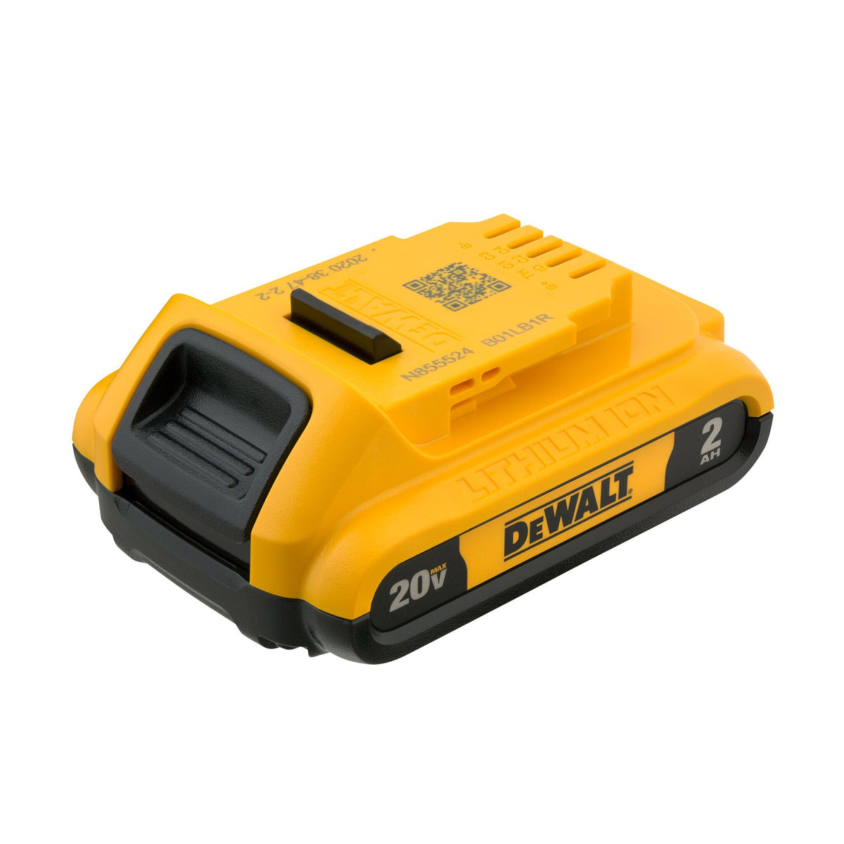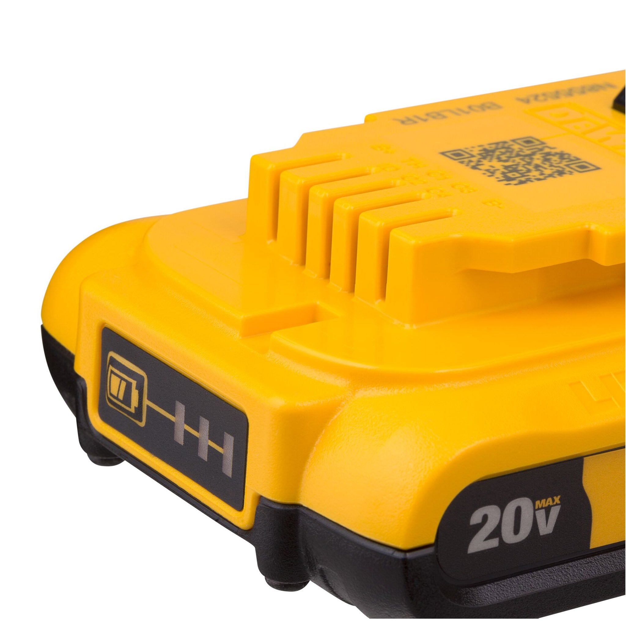 The 20V MAX* Compact Lithium Ion Battery Pack has an extended runtime battery and provides immediate feedback on state of charge with the 3-LED Fuel Gauge System.