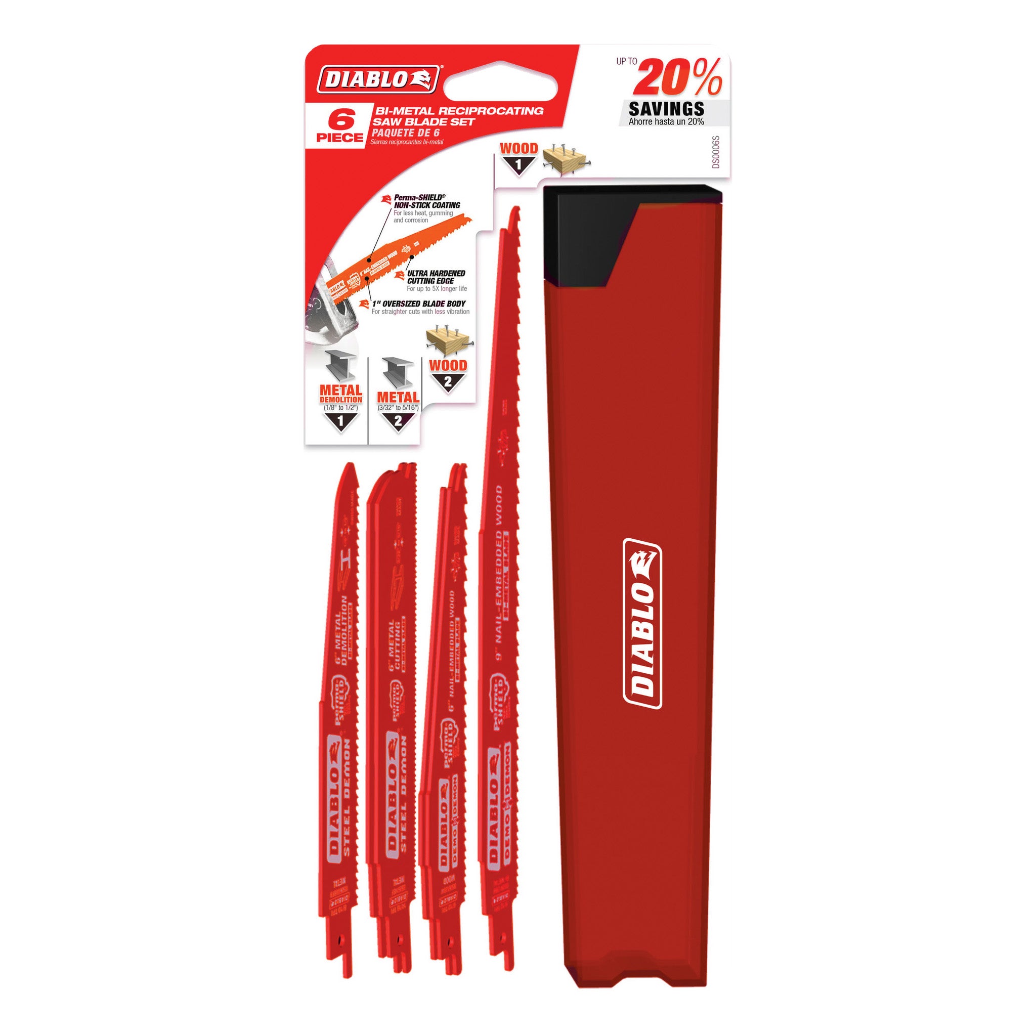 Diablo's 6-Piece demolition reciprocating saw blade set brings together two of the brands top selling blades - Demo Demon and Steel Demon. Diablo's reciprocating saw blades are specifically designed for maximum performance in nail-embedded wood and metal cutting/demolition applications. These high performance blades feature bi-metal technology that delivers up to five times longer life of standard blades on the market. Diablo’s Demo Demon blades feature patented variable tooth technology that provides faster cuts with less vibration. Diablo's Steel Demon blades feature a double tooth configuration with small gullets for faster material removal and extra durability. This set is ideal for the Pro and offers up to 20% savings. Free storage case included.