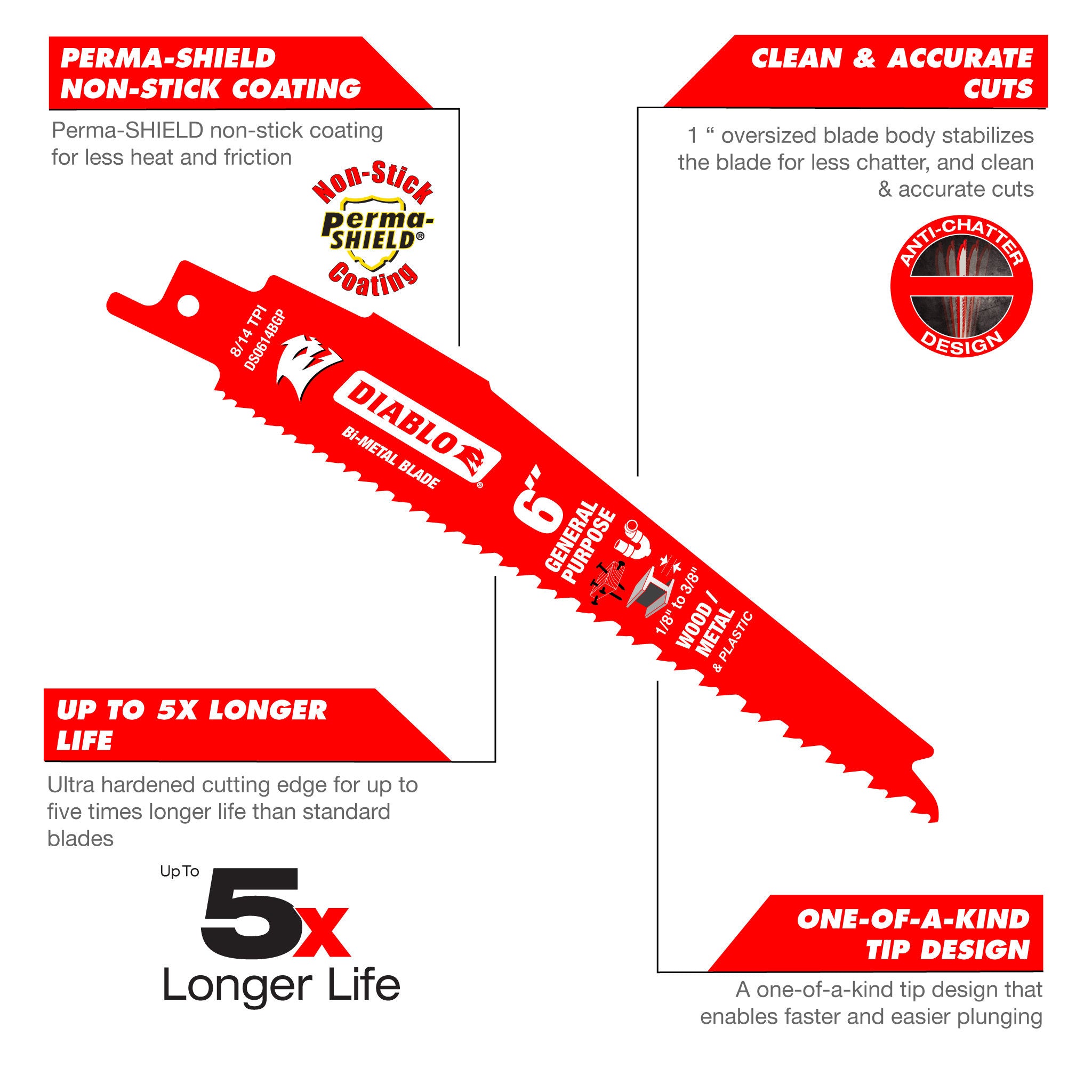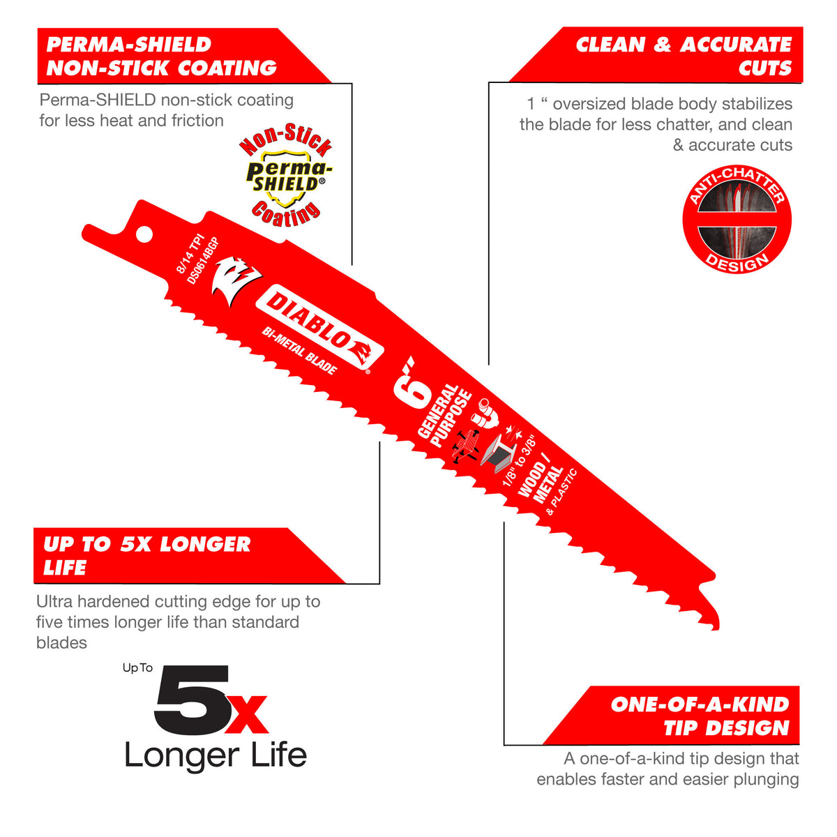 Diablo's reciprocating saw blades are specifically designed for maximum performance in general purpose (nail-embedded wood and metal) applications. These high performance blades feature bi-metal technology that delivers up to five times longer life of standard blades on the market. Diablo's patented variable tooth technology provides faster cuts with less vibration.