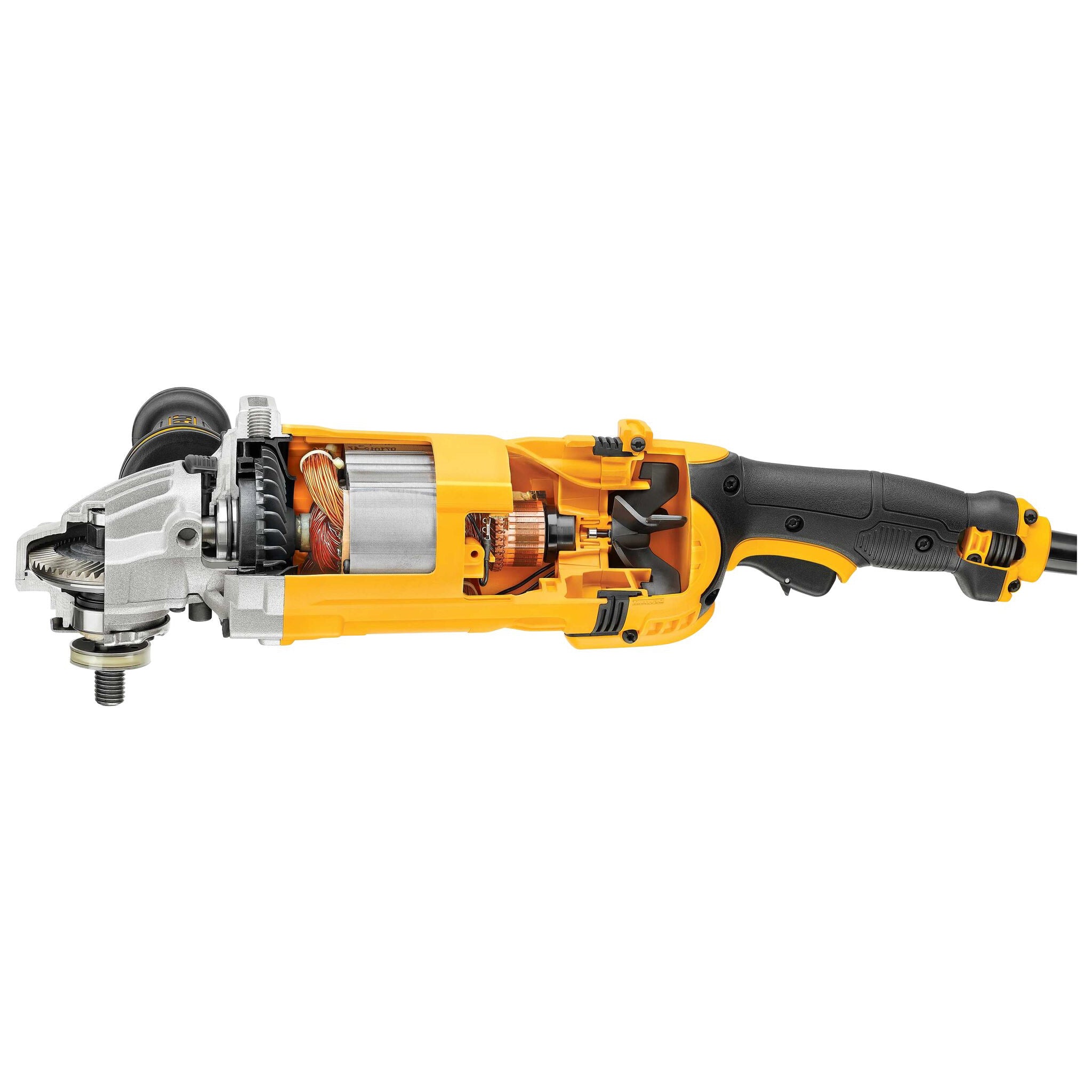 The DWE4557 Angle Grinder has a high power 4.7 HP motor with overload protection and 8,500 rpm for optimal material removal with 7" grinding wheels. Dust Ejection System™ prevents harmful dirst from entering the motor.