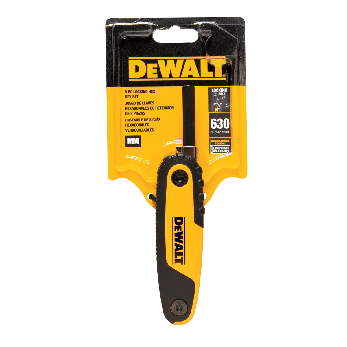 The Folding Locking Hex Key (MM) includes a push-button locking feature allowing for 3 positions and includes 8 of the most commonly used hex key sizes.