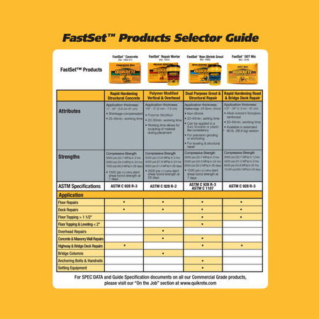 QUIKRETE® FastSet® Concrete Mix (No. 1004) is a special blend of cement with specifically graded fine & coarse aggregates. Sets in 20-30 minutes allowing time for mixing, pouring and finishing. Use at any thickness from 1 1/2" (3.8 cm) to 24" (61 cm). Exceeds the requirements of ASTM C 928 R-3.