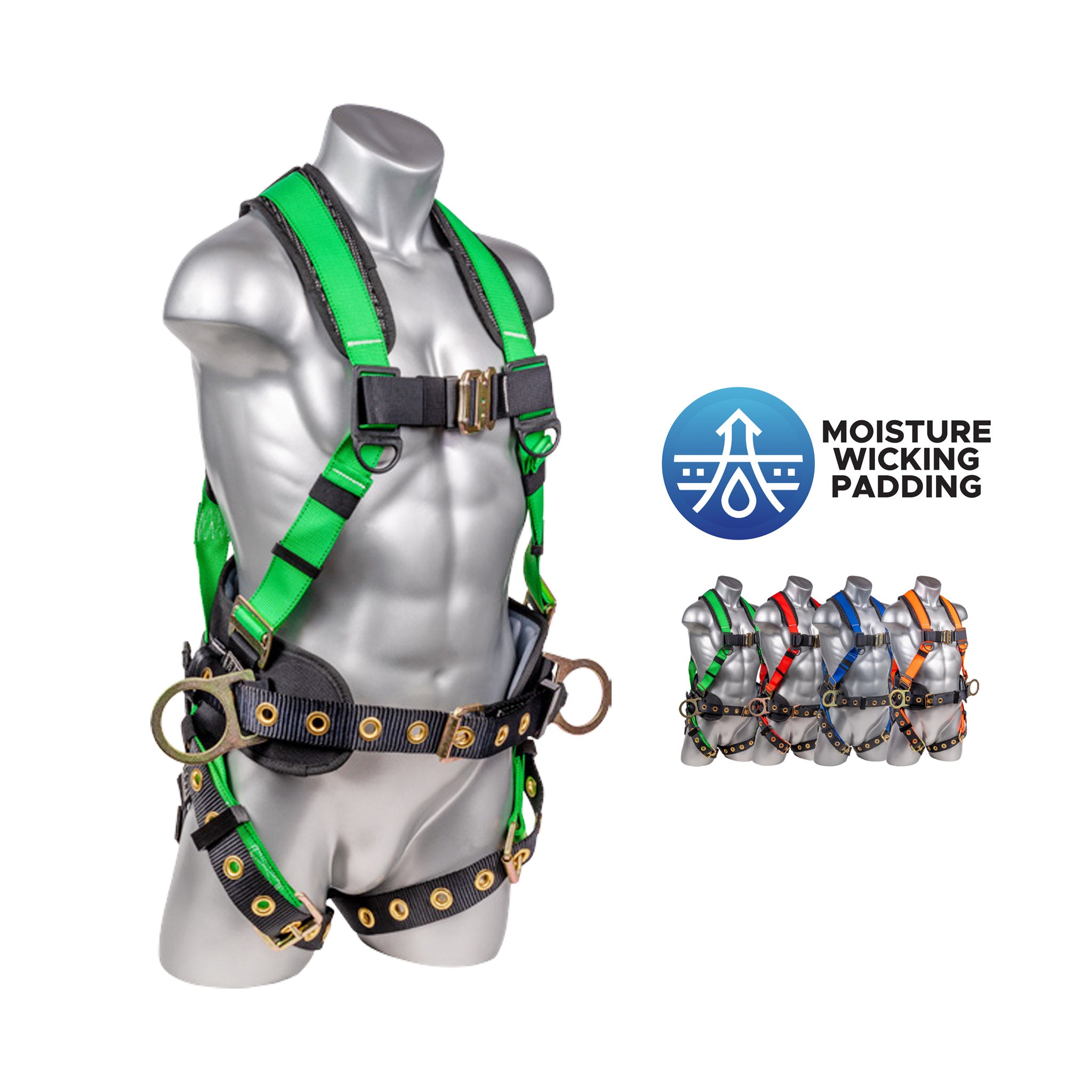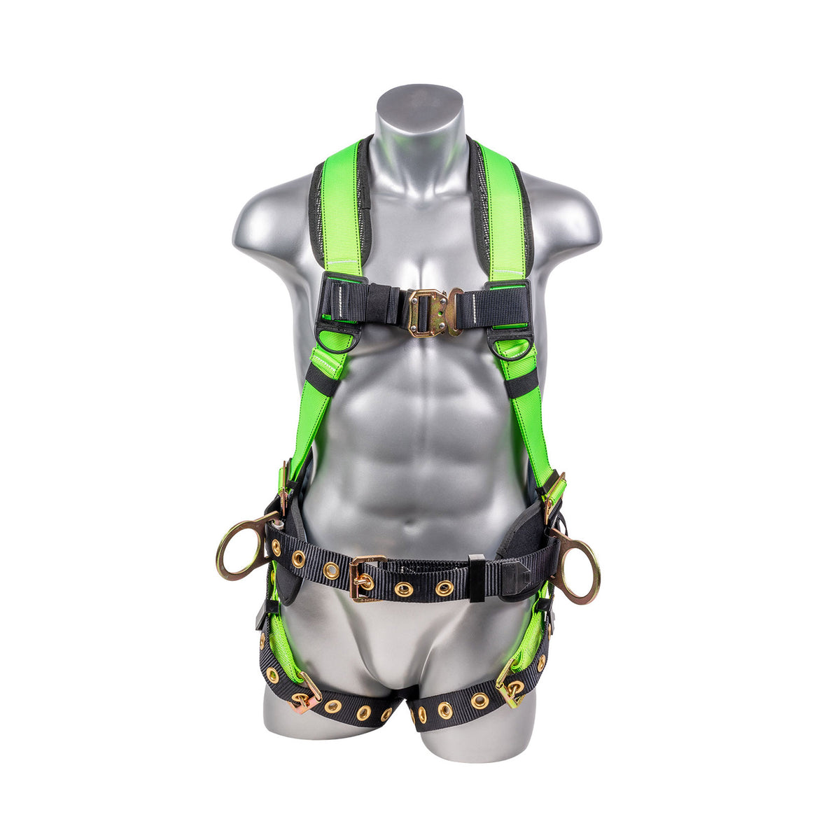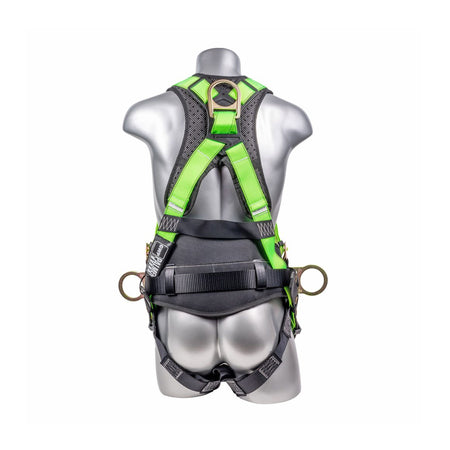 5 point adjustment harness, dorsal D-ring, hip D-rings, heavy duty back support/positioning pad with removable tool belt, Tongue and buckle leg straps. Quick connect chest. Sewn in back pad. Fall indicators. Multiple sizes available. Meets or Exceeds ANSI Z359.11-2014. A10.32-2012.