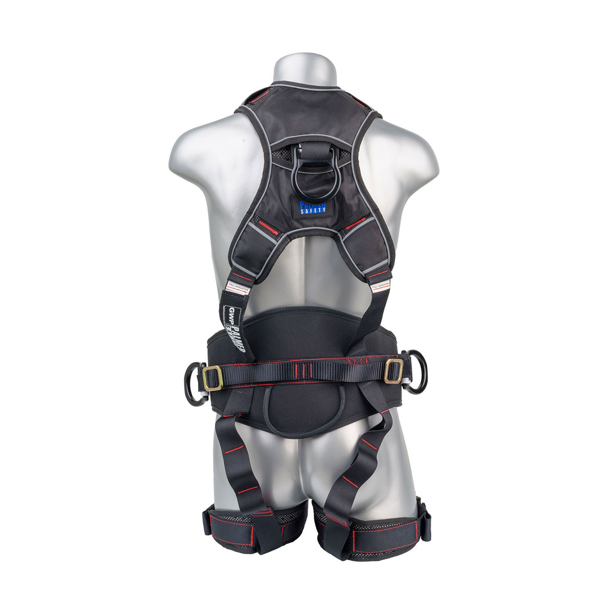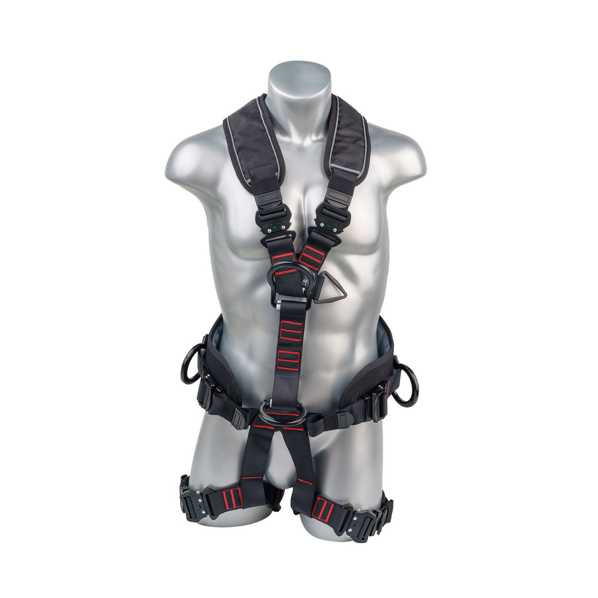 - One (1) dorsal attachment D-ring for fall arrest; one (1) front D-ring for climbing purpose; one (1) ventral D-ring for rope access purpose