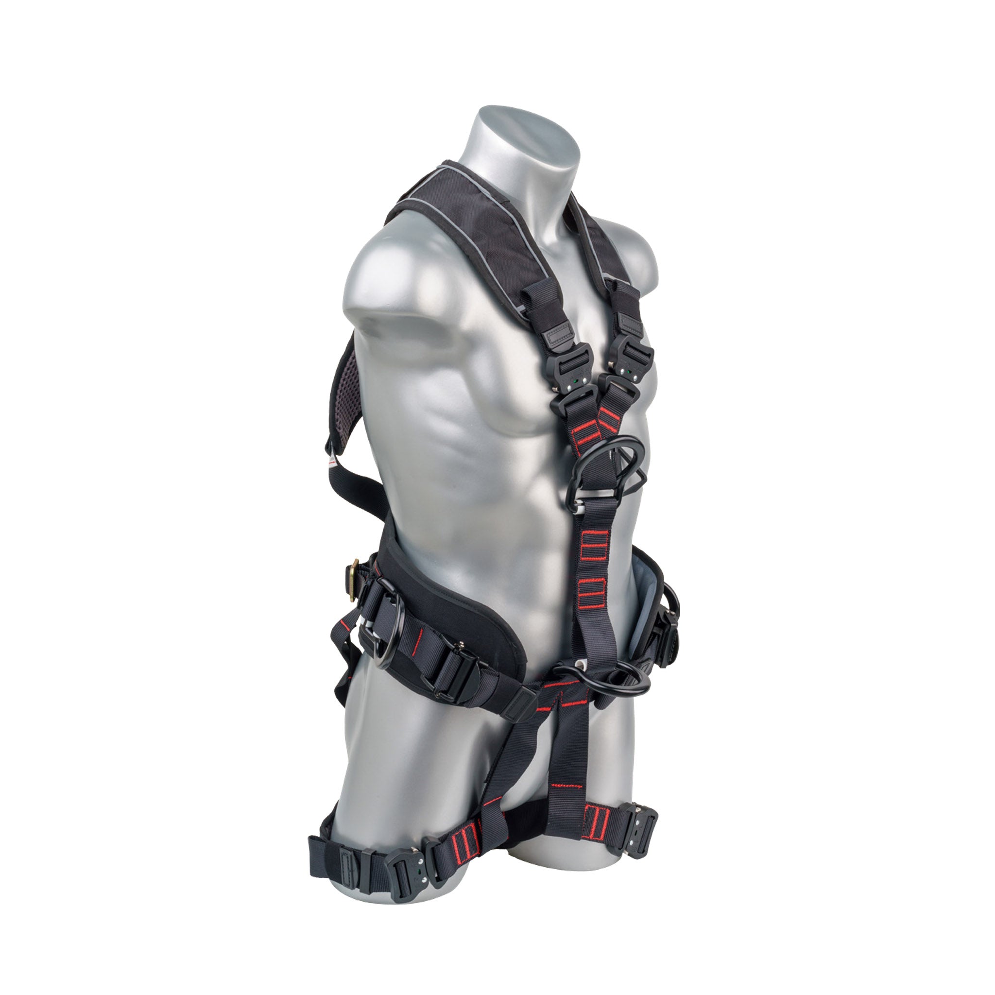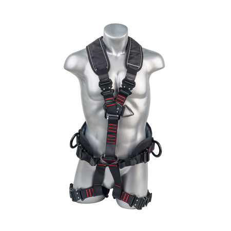 Black top, black padding, 5 point FBH, QCB all aluminum hardware, padded back sewn in, padded legs sewn in. Positioning belt black. 1 Back D-ring, 2 Hip D-rings, 2 Front D-rings. Multiple sizes. SRL back plate. Meets or Exceeds ANSI Z359.11-2014. A10.32-2012
