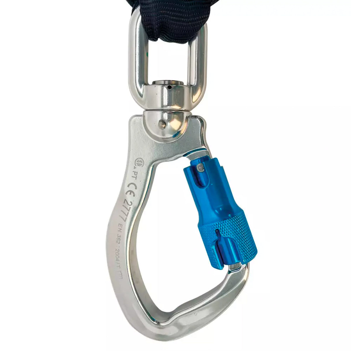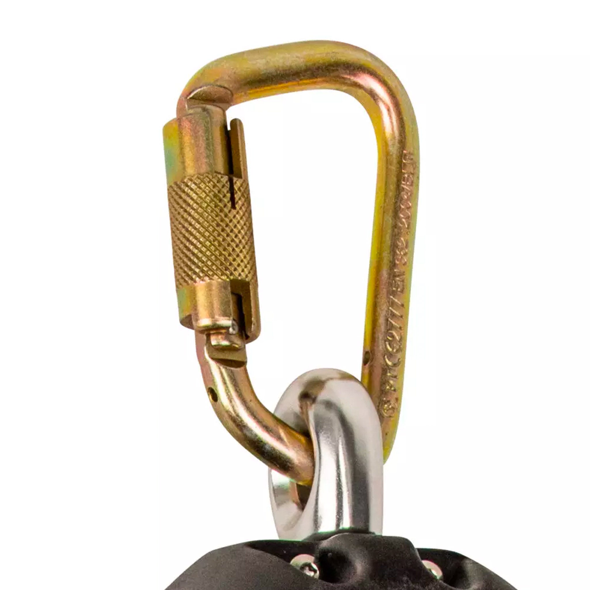 | Materials: | Nylon and glass fiber housing, anodized aluminum swivel carabiner, zinc plated steel carabiner, 3/16" galvanized steel cable, polyester shock pack |