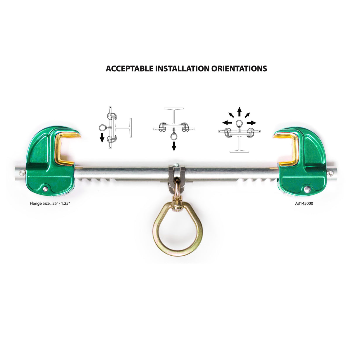 A removable and reusable sliding I-beam anchor, easy to place and remove. This anchor is designed to easily glide along the beam while trailing the worker. Available adjustable from 3”-12” with a minimum flange thickness of .25”.