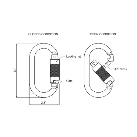 Steel twist lock, 1/2” gate opening, Gate Strength 3600 lbs. Min breaking strength 5000 lbs. Meets or exceeds ANSI Z359.12-2009.