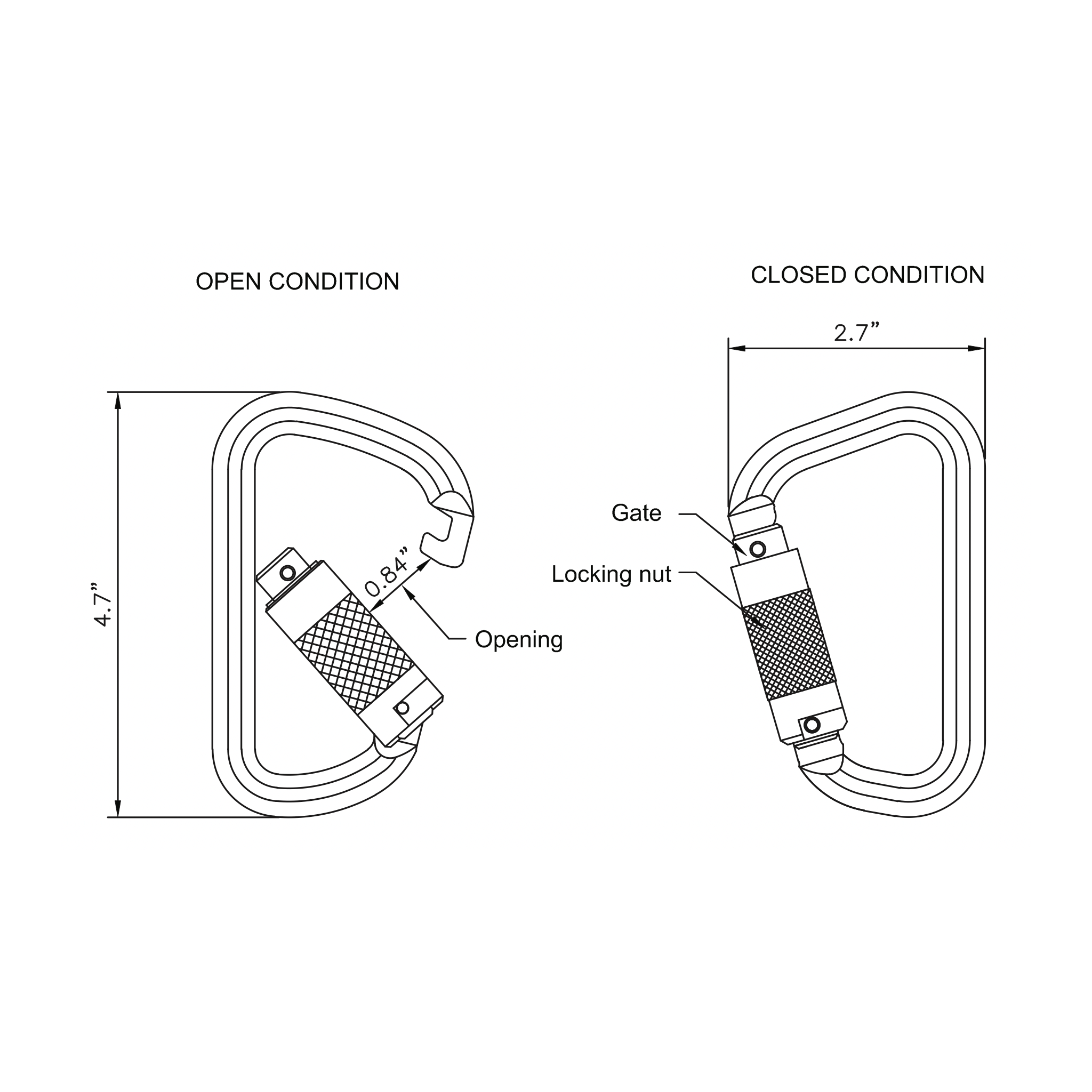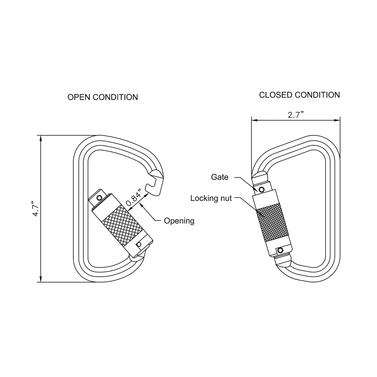 Steel twist lock, 1/2” gate opening, Gate Strength 3600 lbs. Min breaking strength 5000 lbs. Meets or exceeds ANSI Z359.12-2009.