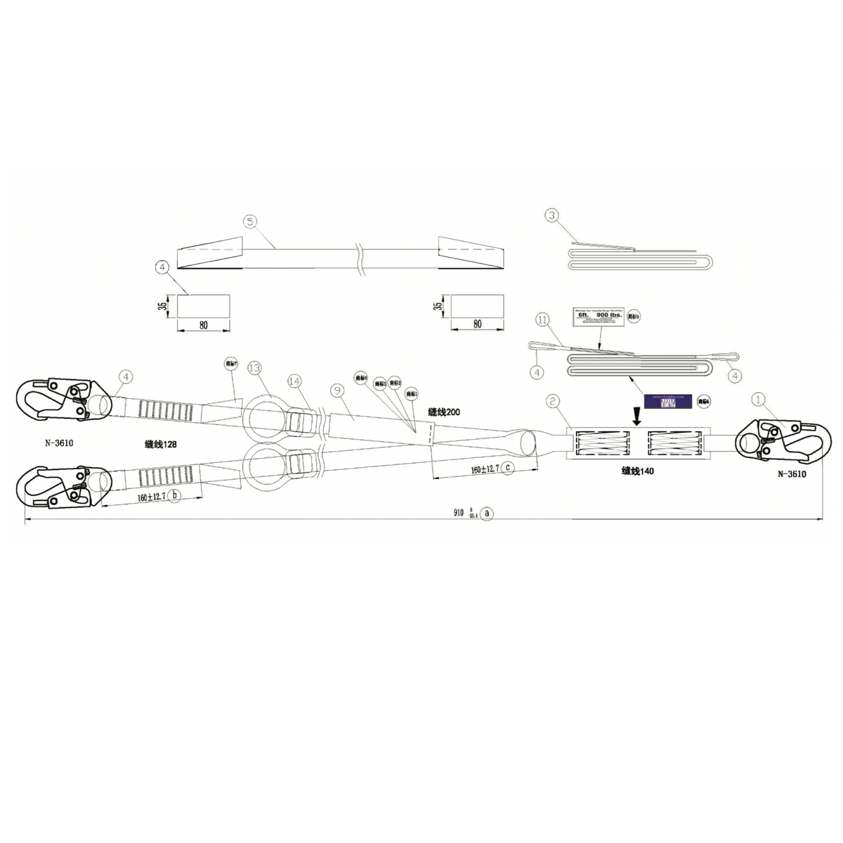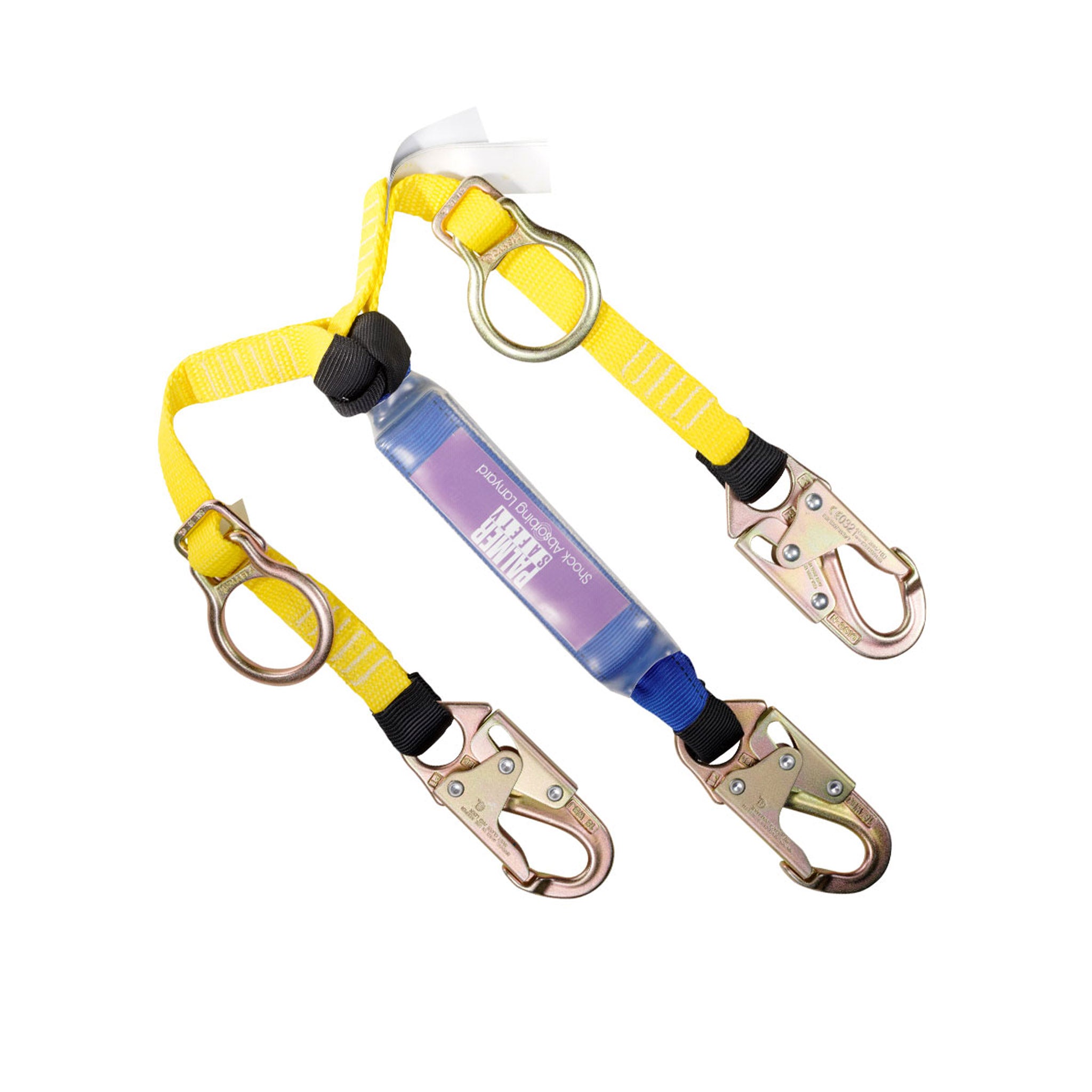 3 ft. Double Leg Tie Back Lanyard with Shock Absorber, 3/4″ Hook, Yellow Webbing. Meets or Exceeds ANSI Z359.13-2013.