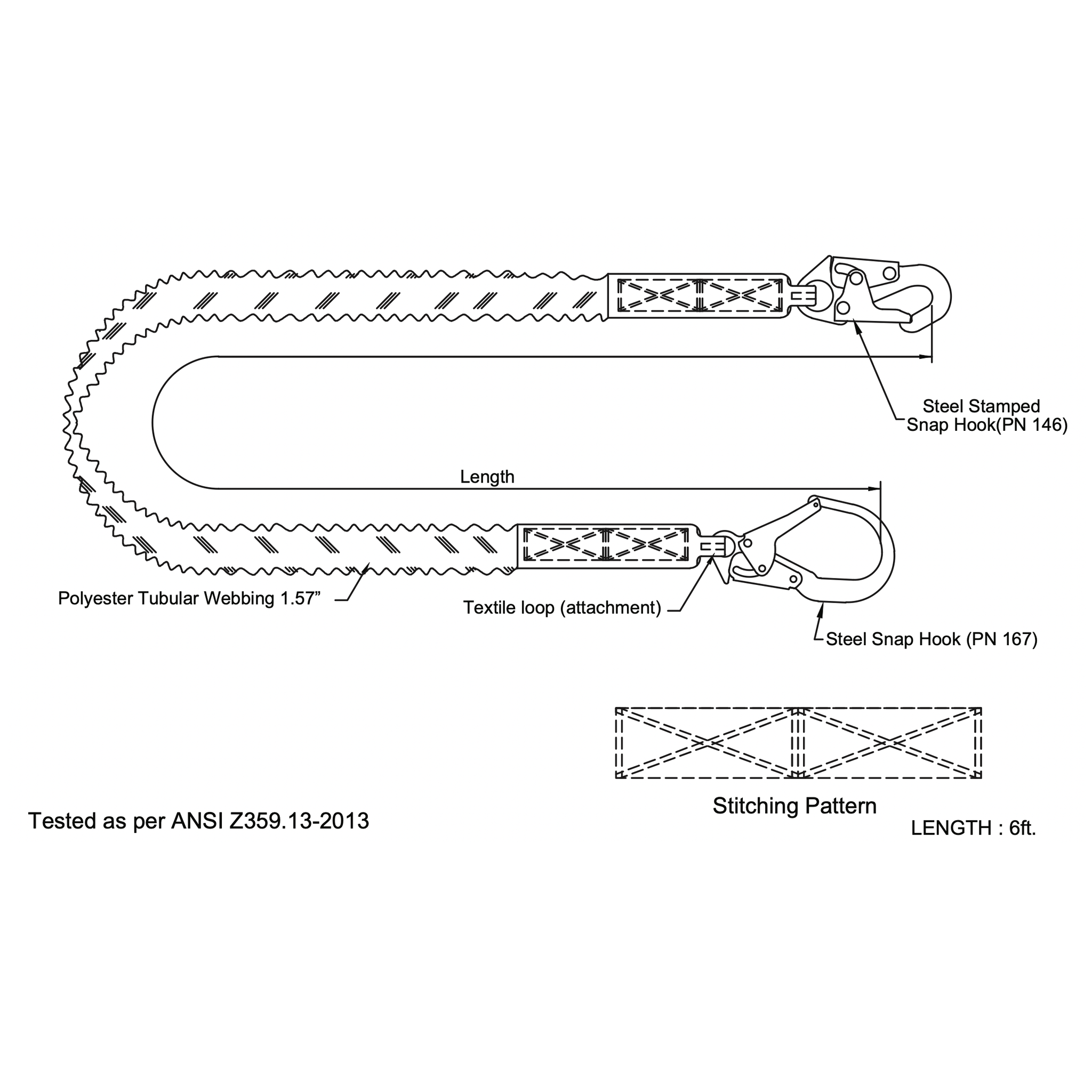- One end of the lanyard equipped with steel stamped snap hook (PN-146) and the other end of the lanyard equipped with a steel snap hook (PN-167).
