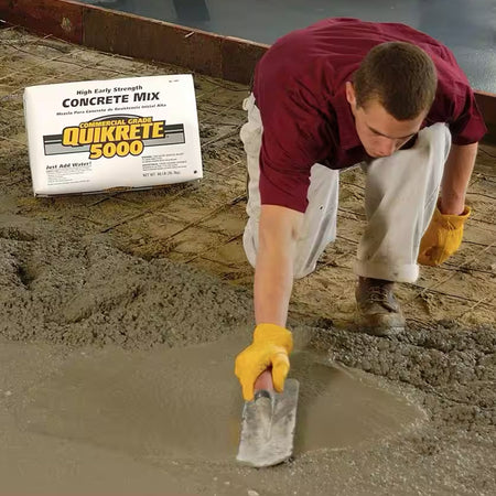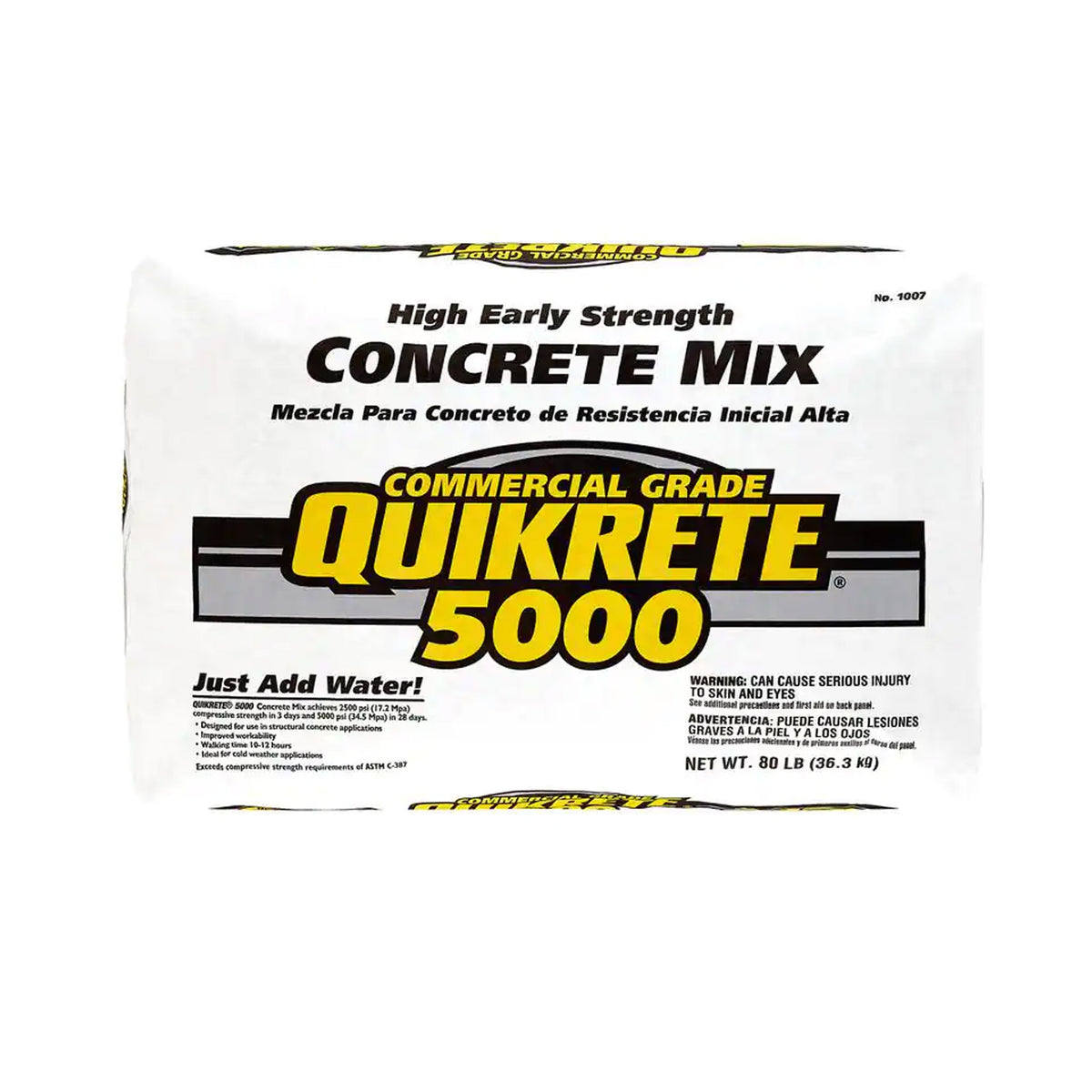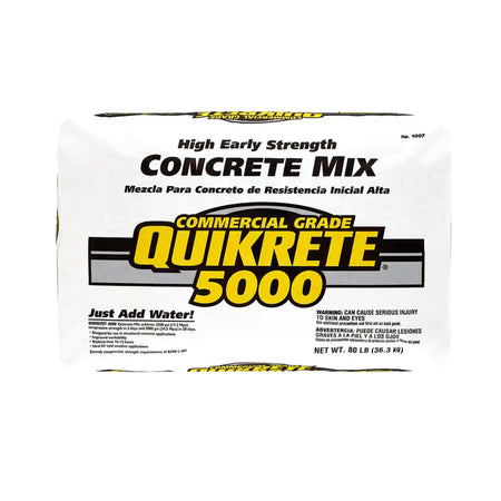 QUIKRETE® 5000 Concrete Mix (No. 1007) is a commercial grade blend of stone or gravel, sand and cement specially designed for higher early strength. Ideal for cold weather application. Achieves 5000 psi after 28 days.