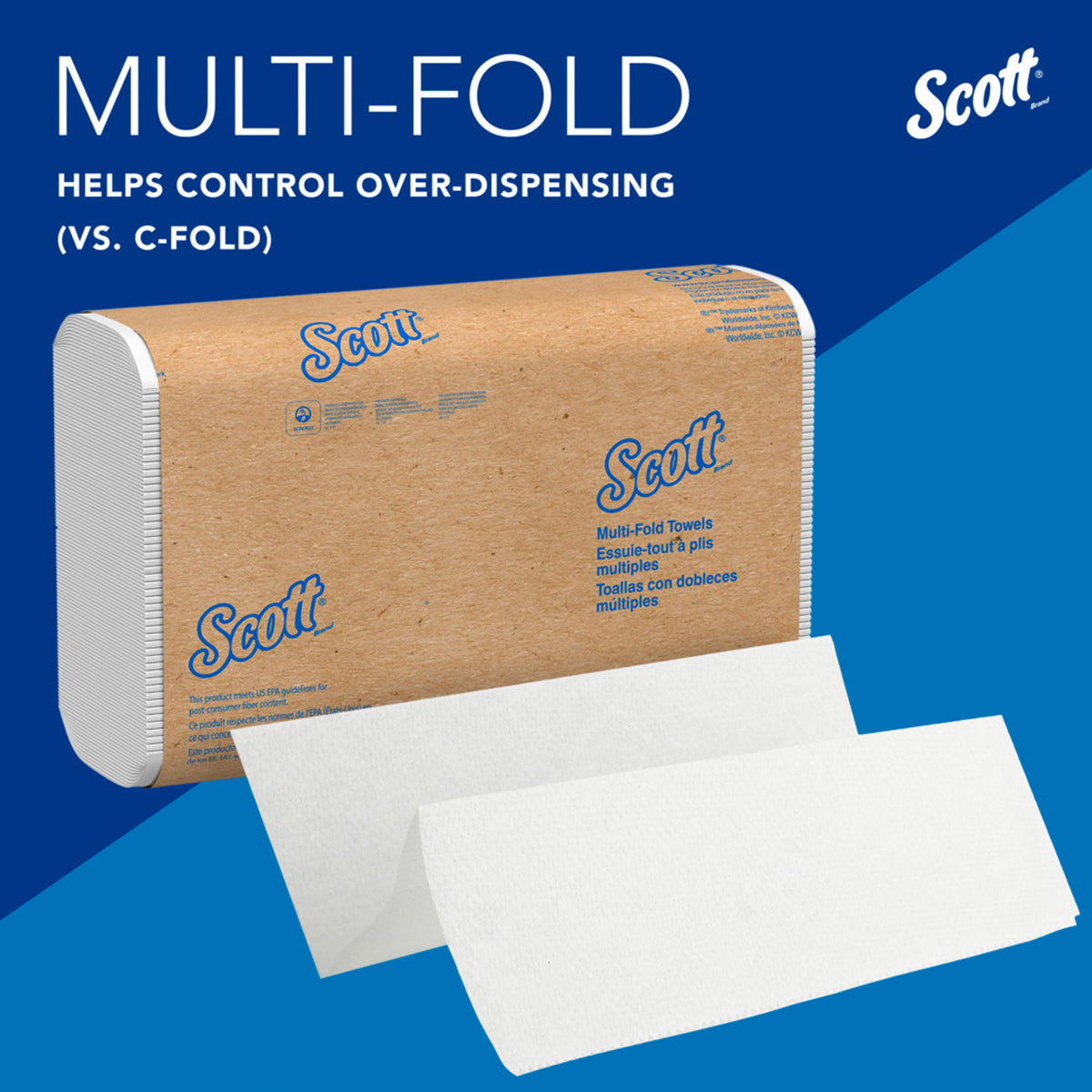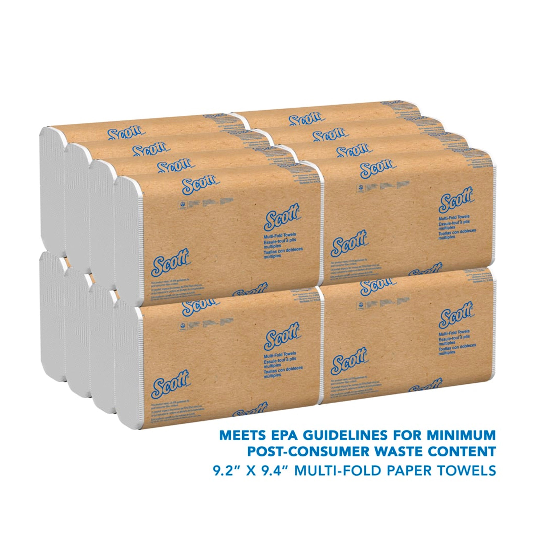 Scott® provides reliable balance of efficiency, performance and value. Whether you need commercial paper towels for your office kitchen or restroom, Scott® Multifold Paper Towels are an excellent—and economical—choice. These commercial paper towels feature Absorbency Pockets™ that absorb a lot of water fast, for superior hand drying. They're designed to reduce waste in your office or business, since they fit into any universal dispenser for trifold paper towels or multifold towels (which helps control over use). Since these Scott® folded paper towels meet EPA guidelines for minimum post-consumer waste content and are FSC® and ECOLOGO® certified, you know they're great choice.