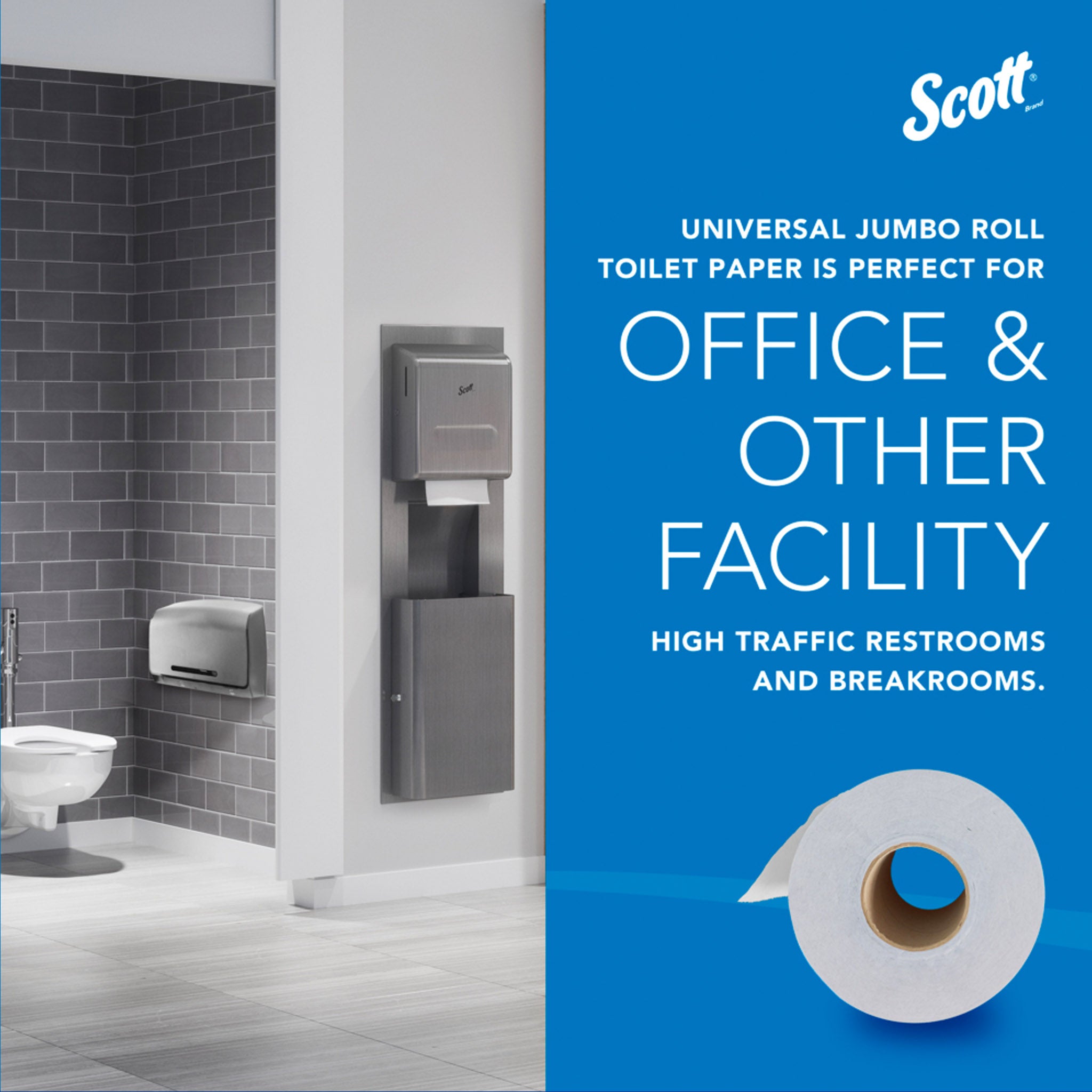 Scott® provides reliable balance of efficiency, performance and value. You have better things to think about than changing your business' toilet paper rolls! Scott® High-Capacity Jumbo Roll Toilet Paper is a reliable and practical choice for your restroom. Each roll of this 2-ply, high-capacity tissue is 1,000 feet long and equals nearly five standard rolls. This large toilet paper roll is designed to fit in dispensers made to accommodate two rolls, so the system is ideal for high-traffic areas, reducing run-outs and refills. In addition, it meets EPA standards for minimum post-consumer waste content and is FSC® and ECOLOGO® certified. Scott® Jumbo Roll 2-ply Bathroom Tissue offers great value and is the ideal balance of strength, absorbency and economy. With Scott® Brand products, you get the quality and performance you can count on – and still stay within your budget.