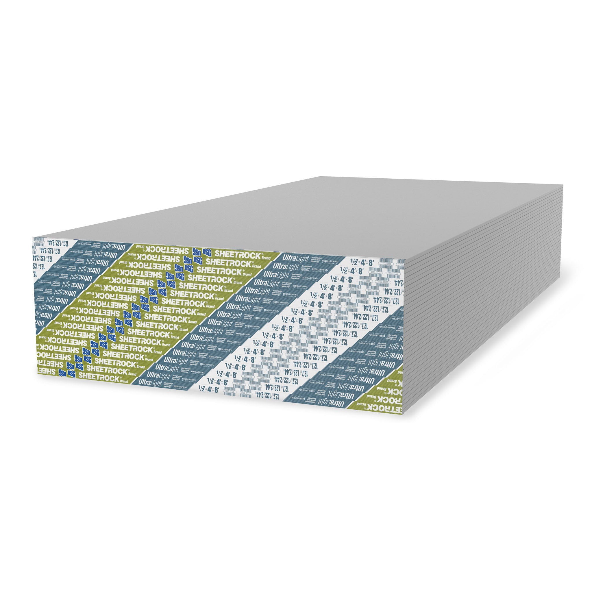 Sheetrock® Brand UltraLight Panels are 1/2 in. (12.7 mm) gypsum panels that feature proprietary core and paper technologies, resulting in a high strength-to-weight ratio composite design. These lightweight panels are also engineered to have superior sag resistance, eliminating the need for traditional 1/2 in. (12.7 mm) sag-resistant ceiling panels. The noncombustible gypsum core is encased in 100% recycled face and back papers, and the face paper is folded around the long edges to reinforce and protect the core. The ends of the panels are cut square and even, while the the long edges are tapered, allowing joints to be reinforced and concealed with Sheetrock® Brand joint treatment systems.
