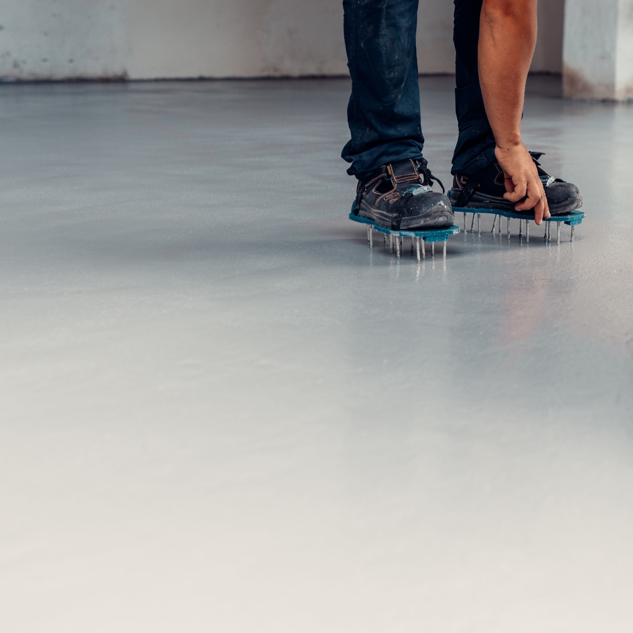 Installation: Pour mixed KOSTER WS 6000 onto the floor and spread using a gauge rake at minimum thickness of 3/8" and a maximum thickness of 1 1/2". For projects where rubber-wheels with a high load are to be used, the minimum thickness should be 1/2". If polishing the KOSTER WS 6000, the minimum thickness should be 1/2". A smoothing tool should be used to blend freshly poured material into adjacent pours. Wear non-metallic cleated shoes, NOT metal spikes. A spike roller should be used immediately after raking or smoothing to help remove any trapped air (within a 10 minute timeframe). Protect poured underlayment from excessive heat, cold, premature drying, or freezing. Setting and drying times will be shortened in hot temperatures and extended in cold temperatures.