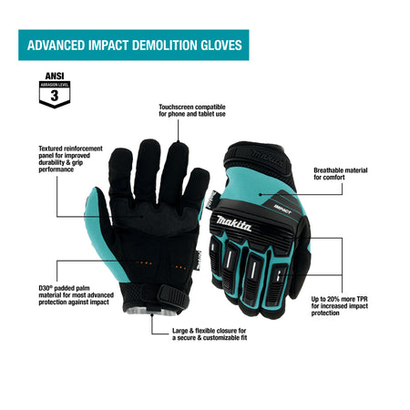 Makita Advanced Impact Demolition Gloves are engineered for high-impact work including demolition and are constructed of up to 20% more thermoplastic rubber (TPR) for increased impact protection. As tough as they are, the gloves are still touchscreen compatible for both smartphones and tablet use. They are ANSI rated at abrasion Level 3 giving them high abrasion resistance. They also have D3O® padded palm material that offers the thinnest and most advanced protection against impact. They are machine washable and are ideal for automotive, demolition, maintenance, and repair, general construction, heavy equipment operation, towing and transportation, and DIY home improvement.